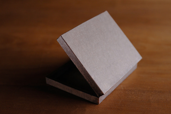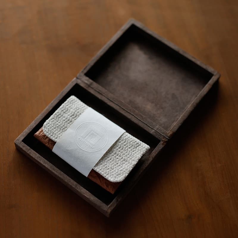 木製の専用箱にも、石州和紙(渋紙)による化粧を施し、柿渋を上塗りした後でんぷん糊で仕上げることで和紙特有の毛羽立ちを抑え、強度も高めています。ただ捨てられるだけのパッケージではなく、開封後も卓上の名刺保管箱としてご活用頂けるようサイズや仕様を工夫しました。